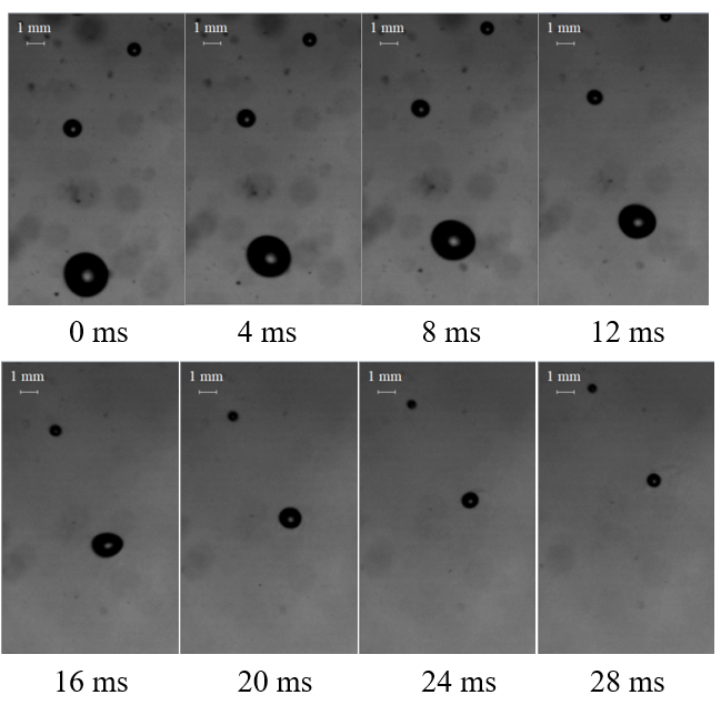 实现了快速增压/减压条件下汽泡冷凝与生长过程的高分辨率观测。实验覆盖压力0.10–2.93 MPa、过热度1.23–11.79℃、过冷度5.46–17.41℃的宽工况范围,系统获得了汽泡半径演化、运动轨迹、相间换热系数等关键参数。 冷凝实验一个气泡演化图